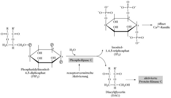 Phosphoinositol-Kaskade, ein wichtiges Signaltransduktionssystem für zahlreiche Hormone, das durch rezeptorvermittelte Hydrolyse von Phosphatidylinisitoldiphosphat (PIP2) zwei sekundäre Botenstoffe erzeugt. Die Wechselwirkungen zwischen dem Hormon und Rezeptor werden über das G-Protein Gp (GTP-bindende Proteine) weitergeleitet und aktivieren die membrangebundene Phospholipase C, die die Hydrolyse von PIP2 zu IP3 und DAG katalysiert (Abb.). Das wasserlösliche IP3 wandert zum ER und bewirkt dort als sekundärer Botenstoff in nanomolaren Konzentrationen die Freisetzung von Ca2+ aus intrazellulären Speichern in das Cytosol. Ca2+-Ionen stimulieren direkt oder über Calmodulin verschiedene biochemische Vorgänge (Glycogenabbau, Exocytose, Kontraktion glatter Muskeln u.a.). Die Lebensdauer dhs IP3 beträgt nur wenige Sekunden. Es wird durch sequenzielle Hydrolyse mittels Phosphatasen zum Inositol abgebaut oder zum Inositol-1,3,4,5-tetrakisphosphat phosphoryliert. Der zweite sekundäre Bote, das unpolare DAG bleibt membrangebunden und aktiviert dort die Protein-Kinase C (PKC); die wiederum phosphoryliert und reguliert verschiedene andere Proteine. Für die Aktivierung der PKC sind Phosphatidylserin (PS) und Ca2+-Ionen essenziell. Der ebenfalls schnelle Abbau des zweiten Boten DAG führt entweder zu Glycerin und den zugrunde liegenden Fettsäuren, wobei Arachidonsäure als Vorstufe für weitere Signalmoleküle (u.a. Prostaglandine) dient, oder es wird zur Phosphaditsäure phosphoryliert (s. Farbtafel).