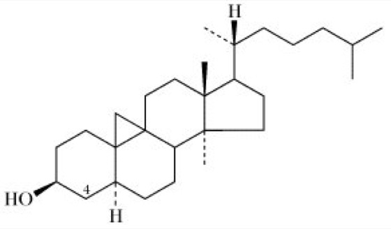 Pollinasterin, Pollinastanol, 4,4-Desmethylcycloartenol, ein Pflanzeninhaltsstoff, der strukturell den Sterinen sowie Cycloartenol nahesteht (Abb.; Mr 400,69Da, F. 112°C). P. wurde besonders aus Pollen von Korbblütlern (Compositae), dem Farn Polypodium vulgare sowie Stechwinden-(Smilax-)Wurzeln isoliert. In diesen Pflanzen ist P. ein wichtiges Zwischenprodukt bei der Biosynthese von Cholesterin. Es unterscheidet sich strukturell von Cycloartenol durch fehlende Methylgruppen am C-Atom 4 und Seitenkettendoppelbindung.