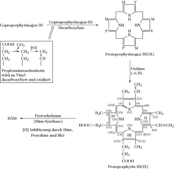 Die Porphyrinbiosynthese verläuft für die biologisch wichtigen Metalloporphyrine vom 5-Aminolävulinat bis zur Stufe von Protoporphyrin IX (Abb. 1 u. Abb. 2) gleich.