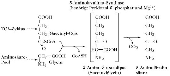 Für die Biosynthese von 5-Aminolävulinat bestehen zwei verschiedene Pfade. In einigen photosynthetischen Bakterien, Hefe und tierischen Mitochondrien entsteht 5-Aminolävulinat durch Kondensation von Glycin mit Succinyl-CoA, katalysiert durch ein einziges Enzym, die 5-Aminolävulinat-Synthase (Abb. 3). In verschiedenen anderen photosynthetischen Bakterien, in Cyanobakterien, höheren Grünpflanzen und Algen wird das intakte Kohlenstoffgerüst von Glutamat mit Hilfe eines Multienzymkomplexes in 5-Aminolävulinat umgewandelt. An den fünf Stufen dieser Umwandlung (five carbon pathway) ist eine Verknüpfung der α-Carboxylgruppe von Glutamat mit einer tRNAGlu beteiligt.