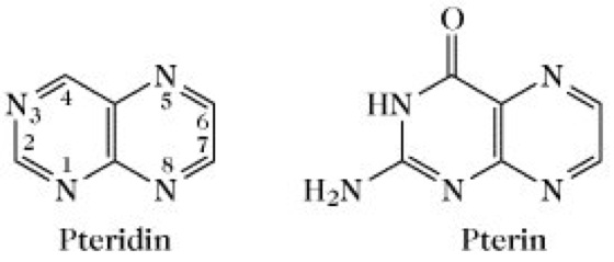 Pteridine, eine Gruppe von Verbindungen, die das Pteridinringsystem enthalten (Abb.). Der Grundkörper der meisten natürlich vorkommenden P. ist das Pterin (Abb.). Ein kleiner Teil der P. stammt von Lumazin ab. Sowohl Folsäure (Tetrahydrofolsäure; Riboflavin) als auch Tetrahydrobiopterin sind P. und dienen als Cofaktor der Wasserstoffübertragung. Für Säugetiere stellt Folsäure ein Vitamin dar, dagegen sind sie fähig Tetrahydrobiopterin zu synthetisieren. Diese beiden Verbindungen werden trotz ihrer chemischen Ähnlichkeit auf unterschiedlichen Wegen gebildet.