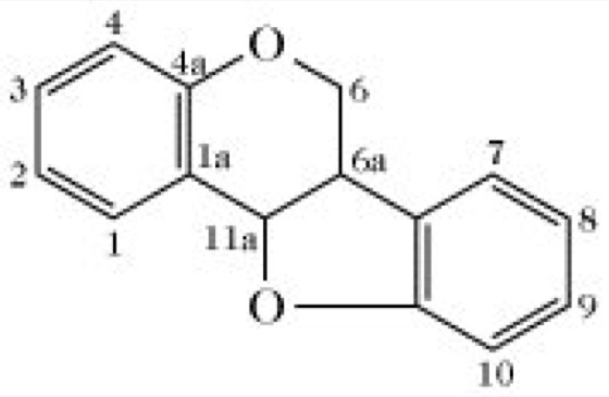 Pterocarpane. Pterocarpanringsystem (systematischer Name: 6a,11a-Dihydro-6H-benzofuro[3,2c][1]benzopyran; gezeigt wird die systematische Ringregisternummerierung).