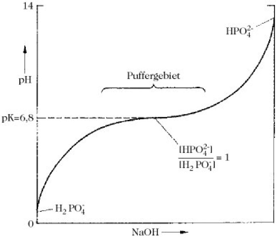 Wenn der Quotient [konjugierte Base]/[Säure] gleich eins ist, d.h. die Hälfte der Säure-Ionen titriert ist, ist pH = pK. In der aus der Gleichung resultierenden Titrationskurve ergibt sich ein Plateau, auf dem der pH-Wert von der Zugabe von Säure oder Base relativ unbeeinflusst bleibt. Dieses Plateau entspricht dem Puffergebiet und ist durch den pK-Wert definiert (Abb. 1, s. auch Titrationskurven der Aminosäuren). Als Regel gilt, dass das Puffergebiet dem pK'-Wert ±1 pH-Einheit entspricht. Das Phosphatsystem (NaH2PO4) ist der beliebteste und am meisten verwendete biochemische P. Es hat jedoch die Nachteile, dass es oberhalb pH 7,5 geringe Pufferkapazität besitzt, dazu tendiert, polyvalente Kationen auszufällen, und Phosphat in einigen Systemen ein Metabolit ist.