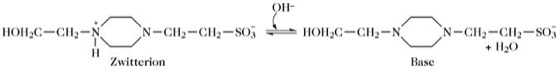 Pufferkapazität. Während der pH-Wert von pK' und dem Quotienten [Protonenakzeptor]/[Protonendonor] abhängt, wird die Pufferkapazität durch die Menge der vorhandenen Pufferkomponenten bestimmt. Die Pufferkapazität ist definiert als die minimale Menge an Säure oder Base, die hinzugefügt bzw. entfernt werden muss, um eine signifikante pH-Änderung hervorzurufen. Zum Beispiel können zwei Lösungen von 4-(2-Hydroxyethyl)-piperazin-1-ethanolsulfonsäure (HEPES) bei pH 7,05 und bei gleichem Volumen verschiedene Mengen an Zwitterion und Base enthalten (Abb. 2).