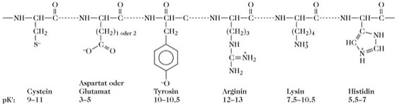 P. in Körperflüssigkeiten. Säuren und Basen, die durch den Stoffwechsel produziert werden, gelangen in die Körperflüssigkeiten und werden am Ende ausgeschieden. Die Körperflüssigkeiten werden temporär durch ihre Puffersysteme geschützt (im Allgemeinen mehr gegen Säure, weil der normale Stoffwechsel zu einer Nettoproduktion von Säure führt). Dabei können auch Proteine als P. wirken, da viele der sauren und basischen Aminosäureseitenketten auf der Oberfläche von Proteinen pK'-Werte aufweisen, die es ihnen ermöglichen, einen Beitrag zum physiologischen Puffersystem zu leisten (Abb. 3).