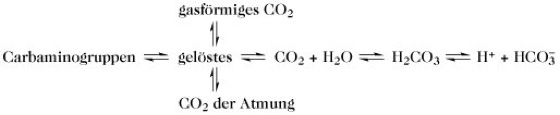 Protein-NH-COO- + H+, und ungefähr 80 % des CO2 wird als Bicarbonat transportiert. Dabei stehen die verschiedenen Transportformen des CO2 im Blut miteinander im Gleichgewicht (Abb. 4).