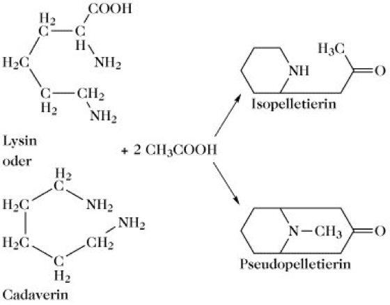 Punica-Alkaloide, eine Gruppe von Piperidinalkaloiden, die ursprünglich aus der Rinde des Granatapfelbaums (Punica granatum L., Droge Cortex granati) isoliert, inzwischen aber auch in anderen Pflanzenfamilien nachgewiesen wurden. Mazerationsdekokte der Droge bzw. isolierte Alkaloide haben als Wurmmittel eine gewisse Bedeutung. Die wichtigsten Vertreter der P. sind Pseudopelletierin und Isopelletierin, deren Biosynthese die Abb. zeigt, sowie N-Methylisopelletierin. Sie sind als höhere Homologe der Tropan- bzw. Pyrrolidinalkaloide anzusehen und werden in analoger Weise gebildet.