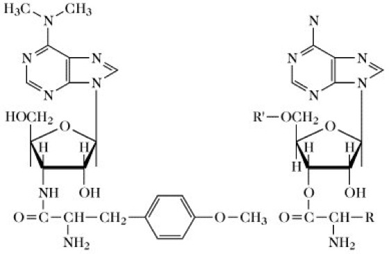 Puromycin. Vergleich der Strukturen von Puromycin (links) und dem 3'-terminalen Ende einer Aminoacyl-tRNA (rechts).