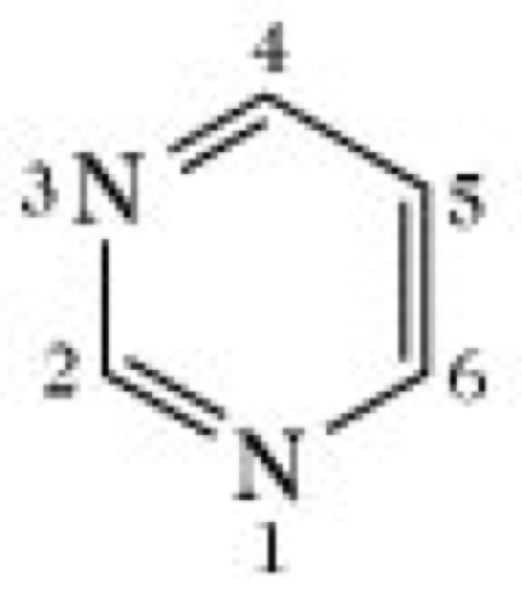 Pyrimidin. Abb. 1. Numerierungssystem von Pyrimidin. Ein älteres System folgte der Nummerierung des Pyrimidinanteils im Purinring (Purin).