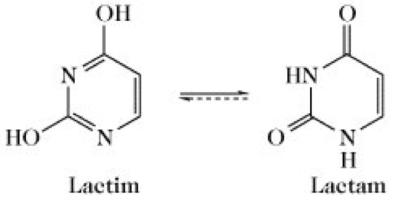 Die Pyrimidinringe der Nucleinsäuren tragen in 6-Stellung eine Amino- oder Hydroxylgruppe, in 2-Stellung stets eine Sauerstofffunktion. Dadurch treten tautomere Strukturen auf, in denen der Wasserstoff am Sauerstoff oder am Ringstickstoff gebunden sein kann. Abb. 2 zeigt dies für das Uracil.