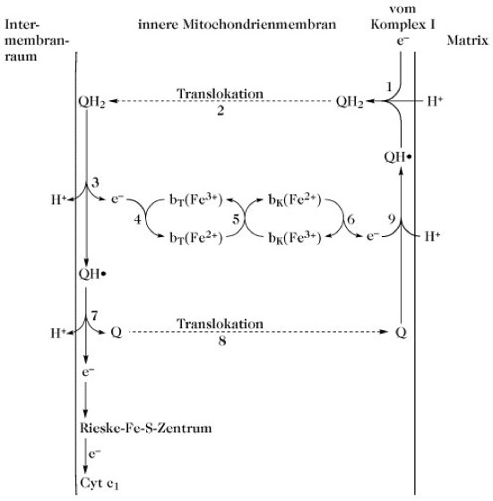 Q-Zyklus, ein Zyklus, der von P. Mitchell [FEBS Lett.56 (1975) 1-6; 59 (1975) 137-139] ersonnen wurde, um der Erfordernis des Redoxschleifenmechanismus (chemiosmotische Hypothese) für einen "[H+ & Elektron]"-Träger im Cytochrom-bc1-haltigen Komplex III der mitochondrialen Elektronentransportkette gerecht zu werden. Der Q-Zyklus schlägt vor, dass Ubichinon (Coenzym Q), die einzige mobile, hydrophobe Redoxkomponente der Kette, an der Elektronenübertragung in Einelektronenschritten vom Cytochrom b zum Cytochrom c1 innerhalb des Komplexes III beteiligt ist, wobei die vollständig reduzierte Chinolform (QH2), die stabilisierte freie Radikalform des Semichinons (QH·) und die vollständig oxidierte Chinonform (Q) mit einbezogen sind. Der Q-Zyklus macht sich außerdem die Beobachtung zunutze, dass Cytochrom b vermutlich ein Dimer ist, das sich aus bT (b566) und bK(b562) zusammensetzt und tief in der Membran eingebunden ist, wobei bT möglicherweise auf der cytosolischen Seite und bK auf der Matrixseite vorliegt. In der Abb., die den vorgeschlagenen Mechanismus darstellt, sieht man, dass für jedes transportierte Elektron zwei Protonen durch die Membran "gepumpt" werden (die Schritte 1 und 9 zur Aufnahme aus der Matrix sowie die Schritte 3 und 7 für die Abgabe in den Intermembranraum; dies entspricht vier H+ je Elektronenpaar).