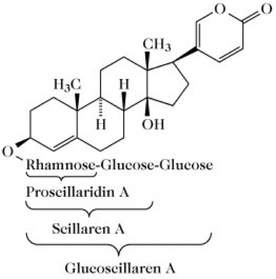 Scillaglycoside, herzwirksame Glycoside, die in der Meerzwiebel enthalten sind, deren Stammpflanze Urginea maritima ist. Man unterscheidet die weiße und die rote Varietät. Arzneilich wird die weiße Varietät verwendet bzw. verarbeitet. Hauptwirkstoff ist Scillaren A (0,06%; Abb.), das durch enzymatische Abspaltung von Glucose aus Glucoscillaren A (Abb.) gebildet wird. Durch weitere Abspaltung eines Glucoserestes entsteht Proscillaridin A (Abb.) das Scillarenin-3-α-L-rhamnosid. Scillarenin gehört zur Bufadienolidreihe und ist das Aglycon dieser Verbindungen. Für Proscillaridin A beträgt die Resorptionsquote etwa 30 % und die Abklingquote etwa 50 %. Hauptinhaltsstoff der roten Varietät ist Scillirosid, das 3-β-D-Glucosid des Aglycons Scillirosidin. Die rote Meerzwiebel kann als Rattenvertilgungsmittel verwendet werden, da Scillirosid eine stark toxische Wirkung auf das Zentralnervensystem der Tiere ausübt.
