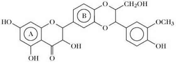 Silybin, ein Flavanolignan aus Silybum marianum (Mariendistel). S. schützt Tiere gegen eine Vergiftung durch Phalloidin (Phallotoxine). Kristallographische Untersuchungen von S. zeigen, dass der Abstand und die Anordnung der aromatischen Ringe A und B (Abb.) beinahe identisch mit den Phe-Resten 9 und 10 in Antamanid sind, das ebenfalls gegen Phalloidinvergiftung schützt. Vermutlich ist die korrekte Anordnung dieser beiden aromatischen Ringe essenziell für die Anlagerung an einen Zielrezeptor auf der Leberzellmembran, wodurch verhindert wird, dass Phalloidin in die Zelle eintritt. [H.L. Lotter Zeitschrift fürNaturforschung39c (1984) 535-542]