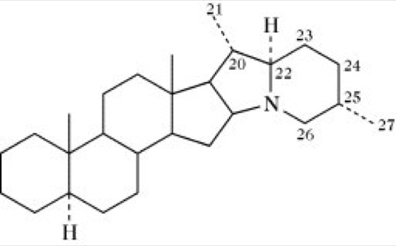 Solanum-Alkaloide, Steroidalkaloide, die in Pflanzen der Nachtschattengewächs-(Solanaceae-)Gattungen Solanum, Lycopersicon, Cyphomandra und Cestrum vorkommen. Die S. leiten sich vom Stammkohlenwasserstoff Cholestan (Steroide) ab. Ihre beiden wichtigsten stickstoffhaltigen Grundkörper sind Spirosolan mit sekundärer und Solanidan mit tertiärer Aminogruppe (Abb.). In der Pflanze liegen S. meist als Glycoalkaloide vor (z.B. α-Solanin und α-Tomatin), aus denen die freien Aglyca durch saure Hydrolyse erhältlich sind. Diese Glycoalkaloide zählen zu den Saponinen und sind oberflächenaktiv und hämolytisch wirksam. Mit Cholesterin entstehen schwerlösliche 1 : 1-Addukte. Die Biosynthese der S. erfolgt aus Cholesterin. Bestimmte S. dienen als Ausgangsstoffe zur Synthese von Steroidhormonen.