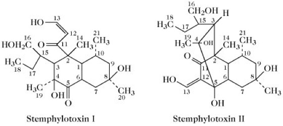 Stemphylotoxine, Phytotoxine (Abb.), die aus Kulturfiltraten von Stemphylium botyrosum Wallr.f.sp. lycopersici isoliert wurden. Sie verursachen die Blattflecken- und Blattbleichkrankheit der Tomate. Die Krankheitssymptome werden durch externe Anwendung der S. ausgelöst. S. hemmen die Inkorporation von 14C-Aminosäuren in Proteine. Durch die Messung dieser Hemmung während des exponenziellen Wachstums in Tomatenzellsuspensionen wird die Toxizität der Stemphylotoxine ermittelt. Des Weiteren inhibieren S. die Verlängerung kleiner Wurzeln sowie das Wachstum von Spirodella oligorrhiza (Wasserlinse). S. I wirkt ungefähr 100mal toxischer als S. II. S. I wird durch saure oder basische Katalyse leicht in S. II überführt. Die S. zeigen eine hohe Affinität zu Eisen(III)- jedoch keine zu Eisen(II)-Ionen [scheinbare Stabilitätskonstanten für Fe3+-Komplexe: 1,7·1024 (I) und 1,6·1024 (II); zum Vergleich 1030-1034 für Hydroxamat-Siderophore (Siderochrome)]. Möglicherweise fungieren S. als Siderophore, indem sie Fe3+-Ionen von der Wirtspflanze absondern und dem Pilz zur Verfügung stellen. Die Biosynthese der S. wird durch Eisen reguliert, wobei die optimale Konzentration für die Stemphylotoxinproduktion bei 2mg/l (Fe2+ oder Fe3+) liegt.