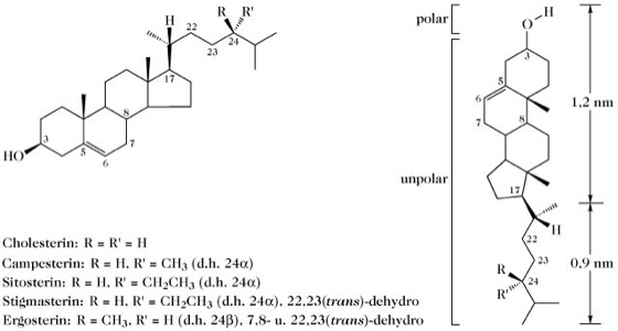 S. sind die am wenigsten amphipathischen Membranlipide. Der einzige hydrophile Molekülteil, die 3β-Hydroxylgruppe, ist klein im Vergleich zu dem großen hydrophoben, kohlenwasserstoffhaltigen Cyclopentanoperhydrophenanthren-Kern (19 C-Atome) und der 17β-Seitenkette (8-10 C-Atome). Cholesterin ist das Hauptsterin der tierischen Membranen, während in Pflanzenmembranen verschiedene Kombinationen aus Sitosterin, Stigmasterin und Campesterol vorkommen. Das Δ5,7-S. Ergosterinstellt das Hauptsterin in den Membranen der meisten Pilze dar. Bei einigen Pilzen kommen jedoch stattdessen Δ5- bzw. Δ7-S. vor. Die Membranen von Prokaryonten enthalten typischerweise überhaupt keine S. Innerhalb der Eukaryontenmembran hat das Sterinmolekül eine Querschnittsfläche von 0,35-0,4nm2 (im Vergleich zu 0,52nm2 für ein Phospholipid) und eine Länge von 2,1nm (im Vergleich zu 3,3nm für Phosphatidylcholin), von der 1,2nm durch den Kern und 0,9nm durch die Seitenkette eingenommen werden (Abb.). Interessanterweise stimmt der Punkt, an dem die Steifigkeit des Kerns in die Flexibilität der Seitenkette übergeht, mit der Position innerhalb der Biomembran überein, an der sich die cis-Δ9-Doppelbindung der ungesättigten Fettsäurereste (z.B. Ölsäure) acylierter Membranlipide befinden. Die Sterinhydroxylgruppe befindet sich innerhalb der Biomembran auf der gleichen Höhe wie die Esterbindungen der acylierten Membranlipide.