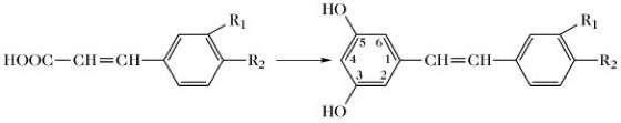 Stilbene, Polyketide, die aus einem Molekül einer Zimtsäure und drei Molekülen Malonyl-CoA entstehen (Tab.). Zwischenprodukte sind Stilbencarbonsäuren, bei denen der Ring A am C-Atom 2 eine Hydroxylgruppe trägt (Abb.).