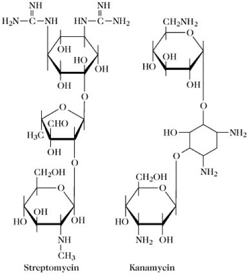 Streptomycin, ein aus Streptomyces griseus isoliertes Antibiotikum mit der Mr 581,6Da. S. ist chemisch ein Aminoglucosid, in dem das Disaccharid Streptobiosamin mit Streptidin glycosidisch verknüpft ist (Abb.). S. hemmt die Proteinbiosynthese an 70S-Ribosomen. Es wird an das 23S-core-Protein der ribosomalen 30S-Untereinheit gebunden. Dieses Protein spielt offenbar eine Rolle bei der korrekten Bindung von mRNA, die bei Anwesenheit von S. gestört ist. Ähnlich wie S. wirken die Aminoglucosidantibiotika Kanamycin (Abb.) und Neomycin sowie Paromomycin, Kasugamycin, Spectinomycin und Gentamycin. Alle werden in der Medizin therapeutisch eingesetzt.