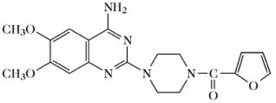 Sympathikolytika, Verbindungen, die eine Sympathikuserregung abschwächen bzw. aufheben und die Wirkung der Sympathikomimetika (z.B. Levarterenol) antagonistisch beeinflussen. S. werden deshalb auch als Adrenolytika bezeichnet und in α1-, α2-, β1- und β2-Adrenolytika unterteilt. Die älteren S. sind sämtlich unspezifische α-Adrenolytika, die vorwiegend wegen ihrer vasodilatatorischen Wirkung verwendet werden. Die wichtigsten Vertreter sind die Mutterkorn-Alkaloide mit Peptidstruktur und Tolazolin. Neuerdings bemüht man sich um die Entwicklung relativ spezifisch wirkender peripherer α1-Rezeptorenblocker, mit denen eine Blutdrucksenkung erreicht werden kann. Ein Vertreter ist Prazosin (Abb.). β-Adrenolytika (β-Rezeptorenblocker) sind erst relativ spät entwickelt worden. Besondere Bedeutung kommt Verbindungen mit einem möglichst spezifischen β1-adrenolytischen Effekt zu, deren Wirkung weitgehend auf das Herz beschränkt bleibt und die die Gefäße und insbesondere die Bronchialmuskulatur nicht beeinflussen (kardioselektive S.). Wichtige β-S. sind die Aryloxypropylamin-Derivate, wie das vom α-Naphthol abgeleitete Propranolol [C10H7-O-CH2-CH(OH)-CH2-NH-CH(CH3)2], das bei Hypertonie und bestimmten Herzerkrankungen eingesetzt wird.