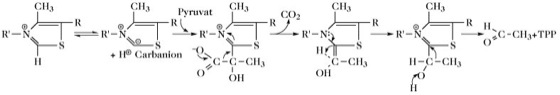 T. bildet mit den Substraten der Thiaminpyrophosphatenzyme aktive Aldehyde: 1) aktiver Acetaldehyd (Hydroxyethylthiaminpyrophosphat, HETPP);