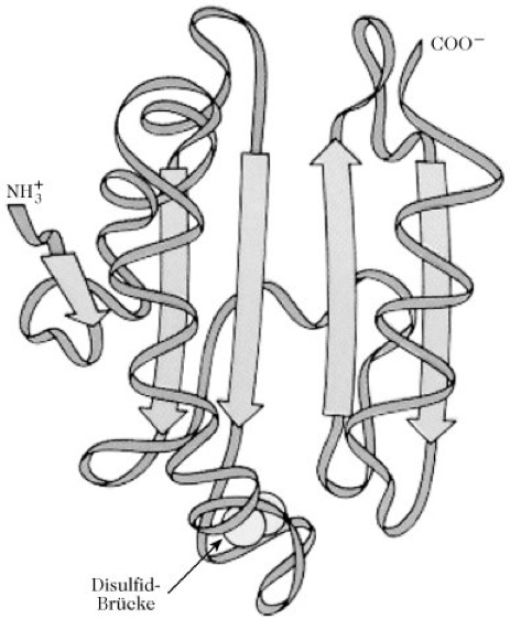 Thioredoxin, ein monomeres ubiquitäres elektronentransportierendes Protein (Mr 12kDa). Charakteristisch für das T. von Archaebakterien bis zum Menschen ist die Sequenz -Trp-Cys-Gly-Pro-Cys- mit zwei eng benachbarten Cysteinresten, die ein typisches Segment einer herausstehenden redoxaktiven Disulfidbrücke bildet (Abb.). T. spielt eine wichtige Rolle bei der Synthese von Desoxyribonucleotiden, wobei es die Ribonucleotid-Reduktase reduziert. Das dabei gebildete Disulfid des T. wird unter der Katalyse der Thioredoxin-Reduktase wieder zur Thiolform reduziert. T. übt als Elektronendonor ebenfalls eine wichtige Funktion bei der Kontrolle der Dunkelreaktionen der Photosynthese aus. Es reagiert auf das Redoxpotenzial des Stromas. Das reduzierte T. aktiviert sowohl die Fructosediphosphatase als auch die Sedoheptulosediphosphatase über einen Disulfidaustausch. Der Mechanismus der Lichtaktivierung der beiden Schlüsselenzyme des Calvin-Zyklus wird dadurch eingeleitet, dass das photoaktivierte Photosystem I lösliches Ferredoxin reduziert, das über die Ferredoxin-Thioredoxin-Reduktase T. oxidiert. Das T. spielt ferner als physiologisches Reduktionsmittel eine bedeutende Rolle bei der Regulation der Aktivität von Enzymen in verschiedenen Zellarten.