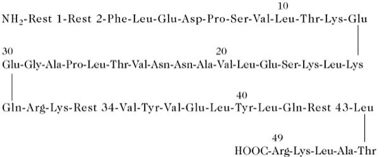 Thymopoietin, 1)Thymin, ein aus dem Thymus isoliertes 49AS-Polypeptidhormon (Abb., Mr 5,6kDa, Rind). Man kennt zwei Formen des T., die sich in Position 1 und 43 der Sequenz unterscheiden. Als aktiver Bereich des T-Zellen-differenzierenden Hormons wird der Sequenzabschnitt 32-36 angesehen, der als Thymopentin, exakter Thymopoietin-5 (TP-5), H-Arg1-Lys-Asp-Val-Tyr5-OH synthetisch leicht zugänglich ist und Bedeutung für die Stärkung der unspezifischen Immunabwehr besitzt.