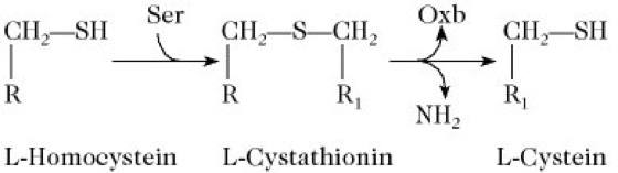 Transsulfurierung. Bildung von L-Cystein aus L-Homocystein (das von L-Methionin abstammt). Ser = L-Serin, Oxb = 2-Oxobutyrat.