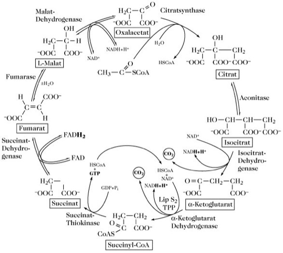 Die Oxidationen im T. erfolgen durch mehrmalige Wasseranlagerung und anschließende Dehydrierung; Sauerstoff spielt direkt keine Rolle: CH3CO-SCoA + 3H2O → 2CO2+ 8[H] + HSCoA. Inizialreaktion des T. ist die Kondensation des Acetyl-Coenzyms A mit Oxalacetat, die durch die Citrat-Synthase katalysiert wird. Unter Wasseraufnahme entstehen Citrat und freies Coenzym A. Aus dem Citrat wird über sieben weitere, teilweise komplexe Reaktionsschritte (Tab. 1) das Oxalacetat regeneriert. Die Reaktionen 3 und 4 sind mit Decarboxylierungen verbunden(α-Ketoglutarat-Dehydrogenase-Komplex).