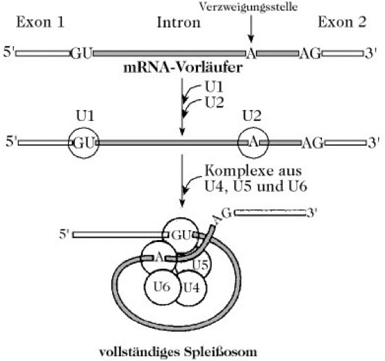 U-snRNP. Zusammenlagerung der U-snRNPs am mRNA-Vorläufer. U1 bindet an die 5'-Spleißstelle, U2 an die Verzweigungsstelle. Ein vorgeformter Komplex aus U4, U5 und U6 lagert sich an, so dass das vollständige Spleißosom gebildet wird.