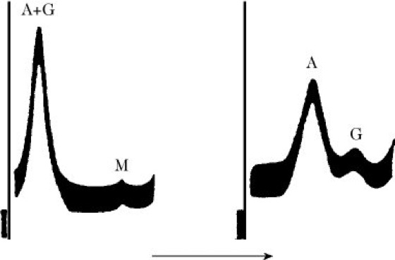 Ultrazentrifugation. Sedimentationsmuster von normalem Menschenserum in der Ultrazentrifuge. Wiedergabe der Konzentrationsverteilung der Proteine mittels der Schlierenoptikmethode. Aufnahme links nach 51min, rechts nach 135min. Zentrifugation bei 59.800 U/min. A = Albumin, 4,5S; G = Globulin, 7S; M = Makroglobulin, 19S.