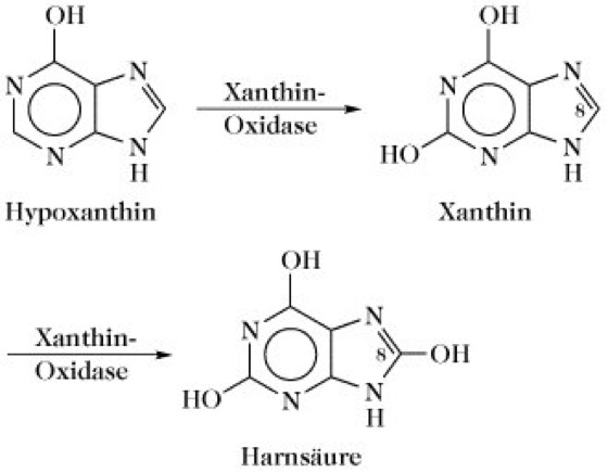 Xanthin-Oxidase, Xanthin-Dehydrogenase, Schardinger-Enzym, ein zu den Eisen- und Molybdän-haltigen Flavinenzymen zählendes dimeres Enzym des aeroben Purinabbaus, das Hypoxanthin und Xanthin zu Harnsäure oxidiert (Abb. 1): Hypoxanthin + H2O + O2 → Xanthin + H2O2;Xanthin + H2O + O2 → Harnsäure + H 2O2. Es ist ein dimeres Enzym, Mr 275kDa, pH-Optimum 4,7, pI 5,35, enthält 2FAD, 2Mo und 8Fe (X. aus Milch). X. hat nur geringe Substratspezifität, da auch andere Purine, z.B. Adenin, aliphatische und aromatische Aldehyde, Pyrimidine, Pteridine und andere heterozyklische Verbindungen oxidiert werden. Ein Mangel an X. bewirkt die Ausbildung einer Xanthinurie.