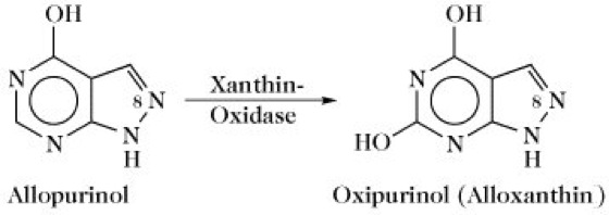 X. und Xanthin-Dehydrogenase werden gelegentlich als unterschiedliche Enzyme betrachtet, wobei mit X. das ursprüngliche Schardinger-Enzym aus der Milch (EC 1.2.3.2) und mit Xanthin-Dehydrogenase ein Enzym aus der Hühnerleber (EC 1.2.1.37) gemeint ist. Diese beiden Enzyme sowie die Aldehyd-Oxidase (EC 1.2.3.1) haben eine sehr große Ähnlichkeit bezüglich ihrer Zusammensetzung und vermutlich ihres Katalysemechanismus, unterscheiden sich jedoch in der Substratspezifität. Die X. fungiert praktisch als ein Mini-Elektronentransportprotein. Das Dimer mit identischen Untereinheiten (Mr 130 kDa) ist bei Säugern nahezu ausschließlich in der Leber und der Dünndarmschleimhaut lokalisiert. Beide Untereinheiten enthalten ein FAD, einen zwischen den Oxidationsstufen Mo(VI) und Mo(IV) sich hin und her bewegenden Molybdän-Komplex und zwei unterschiedliche Fe-S-Zentren. Der sehr komplexe Katalysemechanismus beginnt mit einem Angriff des Enzym-Nucleophils auf das C(8)-Atom des Xanthins, wobei das dort gebundene H-Atom als Hydridion eliminiert wird. Letzters verbindet sich mit den Mo(VI)-Enzym-Komplex. Nach der Reduktion zum Mo(IV) wird das Enzym-Nucleophil durch Wasser attackiert, wobei unter Freisetzung eines Protons Harnsäure entsteht. Der reduzierte Enzym-Mo(IV)-Komplex wird durch O2 wieder zum Enzym-Mo(VI)-Komplex reoxidiert. Hierbei werden Elektronen vom Mo(IV) zu den anderen Redoxzentren des Mini-Elektronentransportproteins geschleust und letztendlich vom Flavin auf O2 transferiert. Das dabei gebildete toxische H2O2 wird durch Katalase zu H2O und O2 zerlegt. Ein kompetitiver Inhibitor der X. ist ein Isomer des Hypoxanthins, das anstelle der CH(8)-Gruppierung ein N-Atom enthält. Das als Allopurinol (Abb. 2) bezeichnete Uricostatikum hemmt ebenso wie sein Oxidationsprodukt Oxipurinol (Alloxanthin) die X. und wird zur Behandlung der Gicht eingesetzt, die durch einen Harnsäureüberschuss verursacht wird.