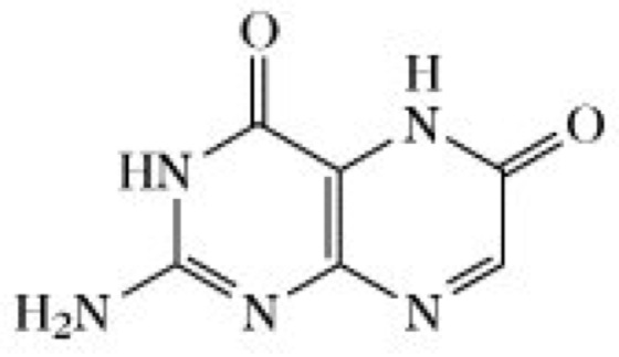 Xanthopterin, 2-Amino-4,6-dioxotetrahydropteridin, ein zur Gruppe der Pteridine gehörendes gelbes Flügelpigment des Zitronenfalters und anderer Weißlinge (Abb.). F. >400 °C. X. ist auch der gelbe Farbstoff der Bienen, Wespen und Hornissen. Die Biosynthese erfolgt aus Guanin und zwei C-Atomen einer Pentose. Es wurde 1925 von H. Wieland und C. Schöpf isoliert und 1940 von R. Purrmann strukturell aufgeklärt.