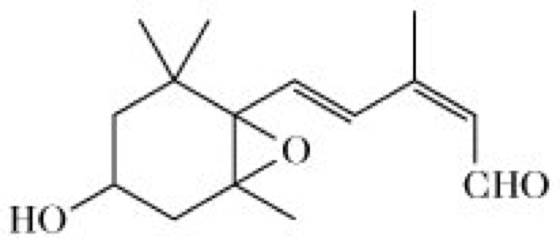 Xanthoxin, ein in höheren Pflanzen weit verbreiteter endogener Wachstumsregulator. X. hat ähnliche inhibierende Eigenschaften wie Abscisinsäure. Es kommt sowohl in der cis,trans- als auch in der biologisch weniger wirksamen trans,trans-Form vor. Wahrscheinlich kann pflanzliches Gewebe cis,trans-X. (Abb.) in (R)-(+)-Abscisinsäure umwandeln.