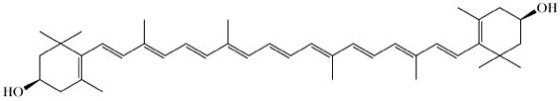 Zeaxanthin, (3R,3'R)-β,β-Carotin-3,3'-diol, 3,3'-Dihydroxy-β-carotin, ein zur Gruppe der Xanthophylle gehörendes Carotinoid (Abb.). Mr 568,85Da, F. 206°C. Z. ist mit Lutein isomer. Es ist als gelber bis gelbroter Farbstoff im Pflanzenreich, besonders im Mais und in Sanddornfrüchten, weit verbreitet und findet sich auch bei Algen und Bakterien. Nativ liegt es in freier Form oder verestert als Dipalmitat vor. Z. zeigt keine Vitamin-A-Aktivität. Das als Antheraxanthin bezeichnete 5,6-Monoepoxid des Z. kommt ebenfalls im Pflanzenreich verbreitet vor.