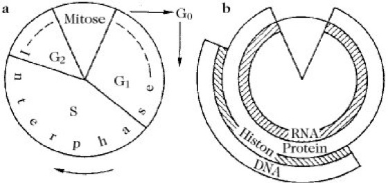 Zellzyklus. a) Schematische Darstellung der aufeinanderfolgenden Phasen des Zellzyklus; die Sektionen des Zifferblatts repräsentieren die relative Dauer jeder Phase. b) Syntheseperioden der verschiedenen Cytoplasma- und Kernkomponenten während des Zellzyklus.