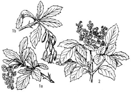 Berberidaceae:1a und 1b Berberitze (Berberis vulgaris). 2 Mahonie (Mahonia aquifolium)