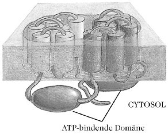 ABC-Transporter, Gruppe von meist in der Cytoplasmamembran lokalisierten Proteinen, die Transporterfunktion haben. Substrate der ABC-Transporter sind Aminosäuren, anorganische Ionen, Mono- und Polysaccharide, Peptide und Proteide. Alle ABC-Transporter bestehen aus vier Kerndomänen, von denen zwei je sechs die Membran durchdringende Bereiche aufweisen ( vgl. Abb. ), die anderen beiden sind ATP-bindende Domänen (ATP-Bindungscasetten; daher: ABC). Diese sind die Grundlage für den energiegekoppelten Substrattransport gegen einen Konzentrationsgradienten. ABC-Transporter sind u.a. verantwortlich für die Multi-Drug-Resistenz von Parasiten und Tumorzellen und die Antibiotika-Resistenz mancher Bakterien. So pumpt bei dem Bakterium Lactococcus lactis ein solcher Transporter Antibiotika aus der Zelle heraus.