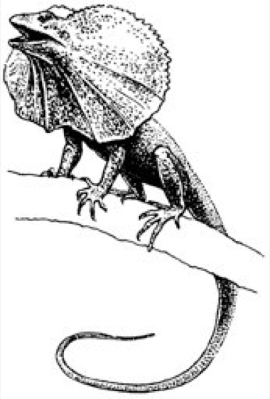 Agamidae: Die Kragenechse (Chlamydosaurus kingii) besitzt am Hals eine große, durch Knorpelstäbe gestützte Hautfalte, die bei Erregung kragenartig hochgestellt wird