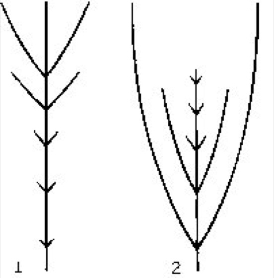 Akrotonie: Akrotonie und Basitonie: Bei Akrotonie (1) werden die peripheren, bei Basitonie (2) vor allem die basalen Achselknospen im weiteren Wachstum gefördert