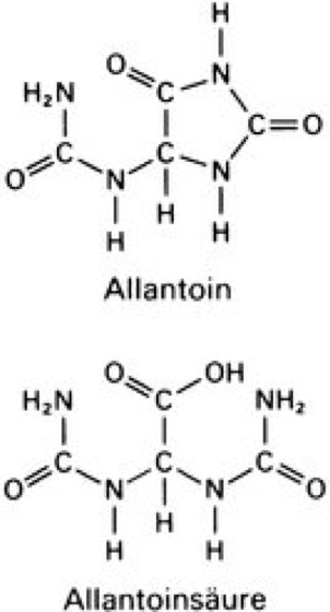 Allantoin, 5-Ureidohydantoin, in Blut und Harn von Tieren, aber auch in Zellsäften von Pflanzen vorkommendes Abbauprodukt der Harnsäure ( vgl. Abb. ). Bei den meisten Säugern, Insekten und Schnecken ist A. das Endprodukt des Purinabbaus (Purin), das aus Harnsäure in einem Schritt in Gegenwart von Uricase entsteht und im Harn ausgeschieden wird. Bei manchen Tieren und Mikroorganismen wird A. zu Allantoinsäure weiter abgebaut und bei anderen zu Harnstoff. In bestimmten Pflanzen (Ureidpflanzen) ist A. zusammen mit Allantoinsäure Bestandteil des löslichen Stickstoffpools.