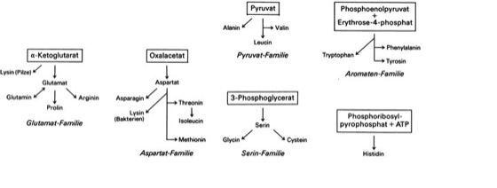Der Mensch und Säugetiere können nicht alle proteinogenen A. selbst aufbauen, sodass ein Teil, die Gruppe der essentiellen A ( vgl. Tab. )., durch die Nahrung aufgenommen werden muss. Die Synthese der proteinogenen A. erfolgt durch Transaminierung der entsprechenden α-Ketosäuren mit Glutamat als Aminogruppen-Donor (Aminogruppe ( vgl. Abb. )). Glutamat selbst entsteht durch direkte reduktive Aminierung von α-Ketoglutarat mit Ammoniak. Beim Abbau werden die proteinogenen A. in einem ersten transaminierenden Schritt zu den entsprechenden α-Ketosäuren umgewandelt, wobei der Aminostickstoff auf α-Ketoglutarat unter Bildung von Glutamat übertragen wird. Letzteres kann durch dehydrierende Desaminierung unter der Wirkung von Glutamat-Dehydrogenase zu Ammoniak und α-Ketoglutarat gespalten werden. Das Gleichgewicht nimmt daher eine Schlüsselstellung bei Aus- und Einschleusung von Ammoniak in die Aminogruppen der A. ein.