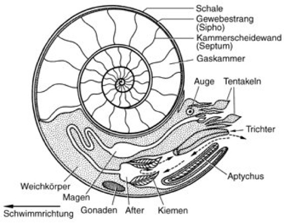 Der Weichkörper der A. ist weitgehend unbekannt. Aus Einzelfunden wird geschlossen, dass sie zehn Tentakel besaßen und somit eher den Dibranchiata ähnlich waren, als Nautilus, denen sie wegen ihrer äußeren Schale am ähnlichsten sehen ( vgl. Abb. ). Ein Trichter zum Ausstoßen von Wasser dürfte vorhanden gewesen sein, denn er gehört zum Grundmuster der Kopffüßer. Spuren von zwei federartigen Kiemen sind nachgewiesen. Die Radula der A. trug sieben Zähnchen und zwei Randelemente in jeder Reihe wie die Dibranchiata. Im Zusammenhang mit den Gehäusen finden sich oft unpaare oder paarige schalenartige Plättchen, die als Anaptychus bzw. als Aptychus bezeichnet werden ( vgl. Abb. ). Sie werden neuerdings als Kieferapparat und Deckel interpretiert und sollen statt einer beißenden, eine schaufelartige und zugleich schützende Funktion gehabt haben. Ein Ösophagus mit Drüsenanhang sowie Kropf und Magen gelten als fossil belegt. Für den Besitz eines Tintenbeutels hingegen gibt es keine Hinweise. Der Weichkörper war länger und „wurmförmiger“ als bei Nautilus und mit kräftigen Rückziehmuskeln ausgestattet. Die Septen und die innere Schalenwand waren mit organischen Membranen ausgekleidet. Die Kammern waren vermutlich veränderbar mit Gas und/oder Flüssigkeit erfüllt. Dem Sipho wird eine den Auftrieb regulierende Funktion zugeschrieben.