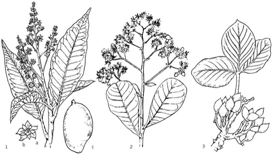 Anacardiaceae:1 Mangobaum (Mangifera indica): a blühender Zweig, b Blüte, c Frucht. 2 Kaschubaum (Anacardium occidentale): Zweig mit Blüten und jungen Früchten. 3 Echte Pistazie (Pistacia vera): Zweig mit Blättern und Früchten
