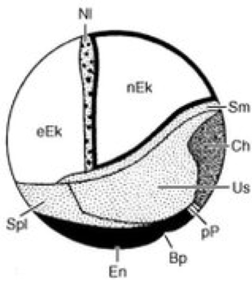 Anlageplan: Anlageplan der holoblastischen Wirbeltiere am Beispiel der Blastula der Schwanzlurche (Lateralansicht). eEk epidermales Ektoderm, nEK neurales Ektoderm, Nl Neuralleiste, Sm Schwanzmyotom, Ch Chorda, Us Ursegment (Somit), pP prächordale Platte, Bp Blastoporus (Urmund), En Entoderm, Spl Seitenplatte