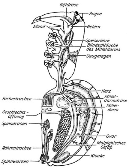 Araneae, Webspinnen, mit fast 34000 Arten in 105 Fam. neben den Milben (Acari) die artenreichste Gruppe der Arachnida. A. besiedeln alle terrestrischen Lebensräume, nur die Wasserspinne, Argyroneta aquatica, lebt unter Wasser. Kennzeichnend für den Körperbau ( vgl. Abb. ) der A. sind vor allem das kurze, sackähnliche Opisthosoma, das mit einem Petiolus beweglich am Prosoma ansetzt, die gleichartigen Laufbeine und die bein- oder tasterartigen Pedipalpen. Viele Spinnen haben einen dicht beborsteten Körper. Die Beine werden durch Muskeln gebeugt, aber durch Hämolymphdruck gestreckt. Sie können bei vielen Arten im Gelenk zwischen Coxa und Trochanter autotomiert (Autotomie) werden. A. besitzen Giftdrüsen in den Cheliceren, die wichtig für den Beutefang sind. Die Gifte, Neurotoxine oder cytotoxisch bzw. hämolytisch wirkende Substanzen, können z.T. auch dem Menschen gefährlich werden, wobei die Cheliceren der meisten Arten zu schwach sind, die menschliche Haut zu durchdringen. Das zweite wichtigste Hilfsmittel beim Beutefang ist das Netz, das mit Hilfe der Spinndrüsen im Opisthosoma angefertigt wird. Atmungsorgane der A. sind ursprünglich zwei Lungenpaare, die bei den Neocribellatae teilweise oder ganz durch Tracheen ersetzt sein können. Geschlechtsdimorphismus ist weit verbreitet, und zwar sowohl Unterschiede in der Färbung (z.B. Salticidae, Lycosidae) als auch in der Größe, wobei die Weibchen z.T. wesentlich größer sind als die Männchen. – Klassifizierungen der A. wurden nach unterschiedlichen Merkmalen vorgenommen. So werden nach Lage der Spinnwarzen Mesothelae und Opisthothelae unterschieden, nach Stellung der Cheliceren Orthognathae und Labidognathae, nach dem Bau der Geschlechtsorgane Haplogynae und Entelegynae und nach dem Vorhandensein eines Cribellums Cribellatae und Ecribellatae, wobei man heute annimmt, dass das Cribellum eine Autapomorphie der Stammart der A. war und bei verschiedenen Gruppen konvergent zurückgebildet wurde. Zu den A. gehören u.a. folgende Fam.: Agelenidae, Araneidae, Amaurobiidae, Clubionidae, Lycosidae, Salticidae, Theraphosidae.
