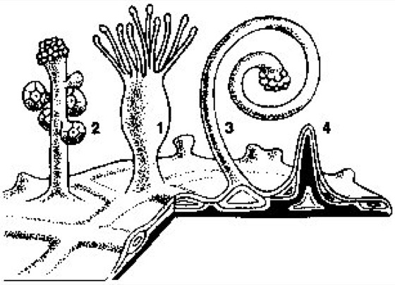 Arbeitsteilung: Morphologisch verschieden differenzierte Tiere eines Tierstocks von Hydractinia echinata (Hydrozoa). 1 Nährpolyp, 2 Geschlechtspolyp, 3 Wehrpolyp. Die Polypen (Einzeltiere) stehen auf einer Grundplatte, der auch harte Stacheln (4) entspringen (Artname!)
