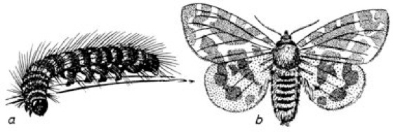 Arctiidae: Brauner Bär (Arctia caja L.). a Raupe, b Falter