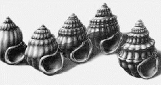 Artbildung: Ein Beispiel für Artumwandlung sind die fünf Stadien aus einer kontinuierlichen evolutiven Abwandlungsreihe der Gehäuseform der Wasserschnecke Viviparus, wie sie fossil in übereinander liegenden Schichten des Pliozäns gefunden wurden. Das älteste Schneckenhaus (ganz links) sieht vollkommen anders aus als das jüngste (ganz rechts), die Zwischenformen aber stellen einen lückenlosen Zusammenhang zwischen den Extremformen her