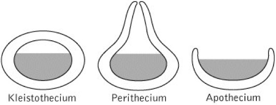 Ascoma: Die Haupttypen der Ascomyceten-Fruchtkörper sind Kleistothecium (allseits geschlossen), Perithecium (mit präformierter Öffnung) und Apothecium (offen, becher- bis schüsselförmig)